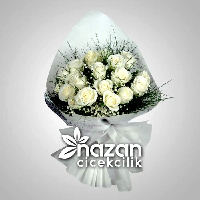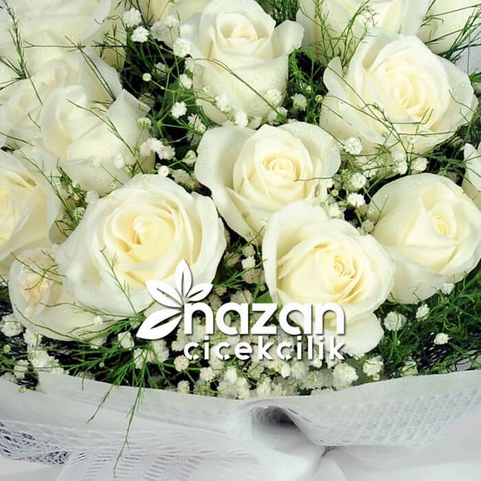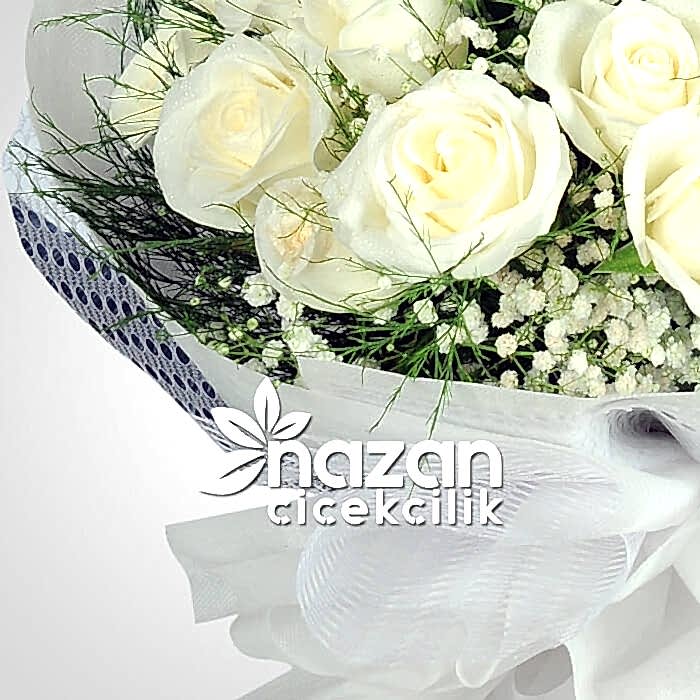 Beyaz gül, cipsofilya, yeşillikler ile hazırladığımız şık bir beyaz gül buketi