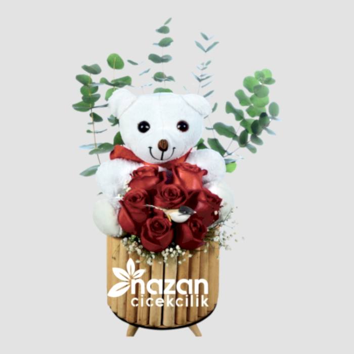 Ahşap Saksıda Küçük Peluş Ve Kırmızı Güller