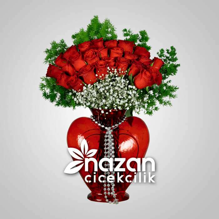 Kırmızı Kalp Vazoda 25’Li Kırmızı Gül