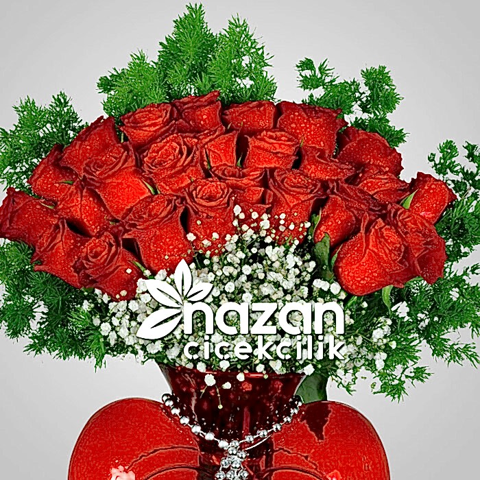 Kırmızı Kalp Vazoda Kırmızı güllerle hazırladığımız şık bir aranjman