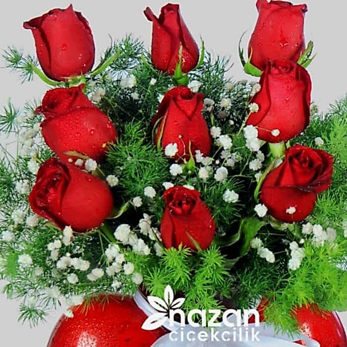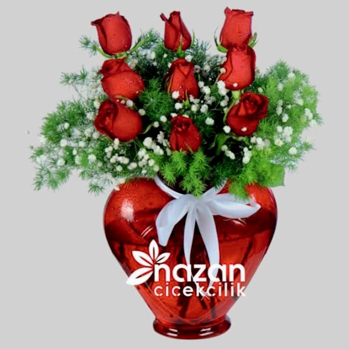 Kırmızı kalp vazo içerisine 9 adet kırmızı gül yeşillik ve cipsofilya kullanılarak hazırlanmış şık bir tanzim