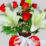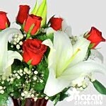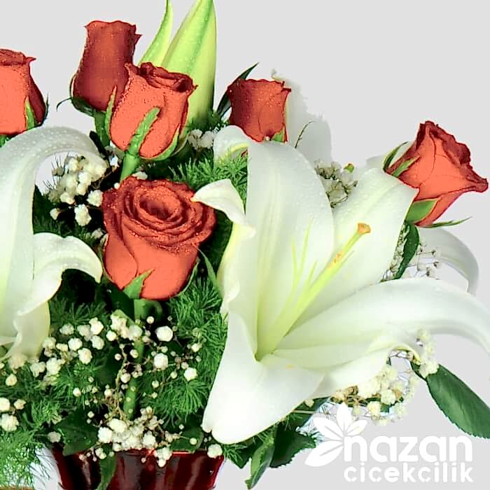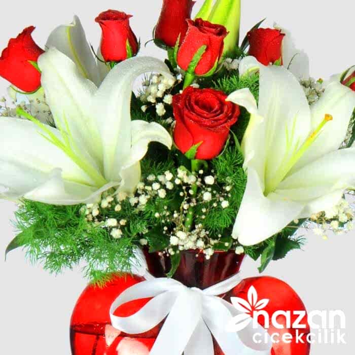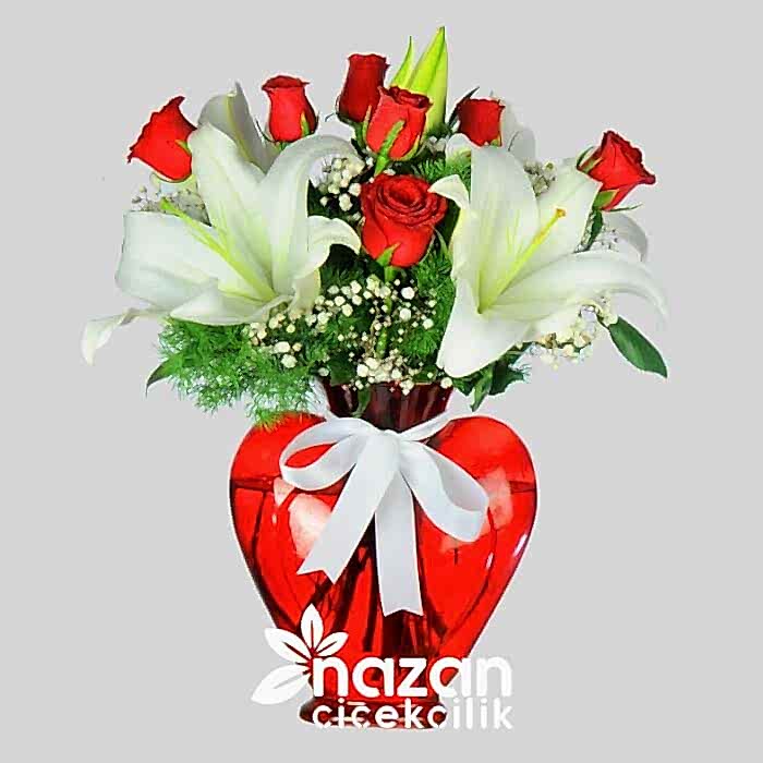 Kırmızı kalp vazo içerisine mis kokulu beyaz lilyumlar ve aşkın temsilcisi kırmızı güller kulanılarak hazırlanmış şık bir tanzim