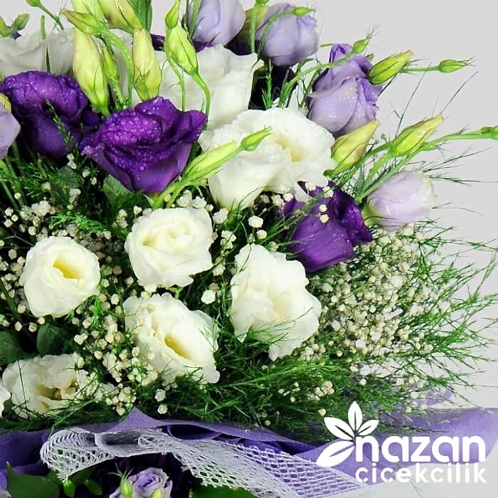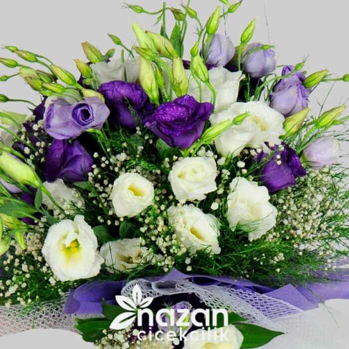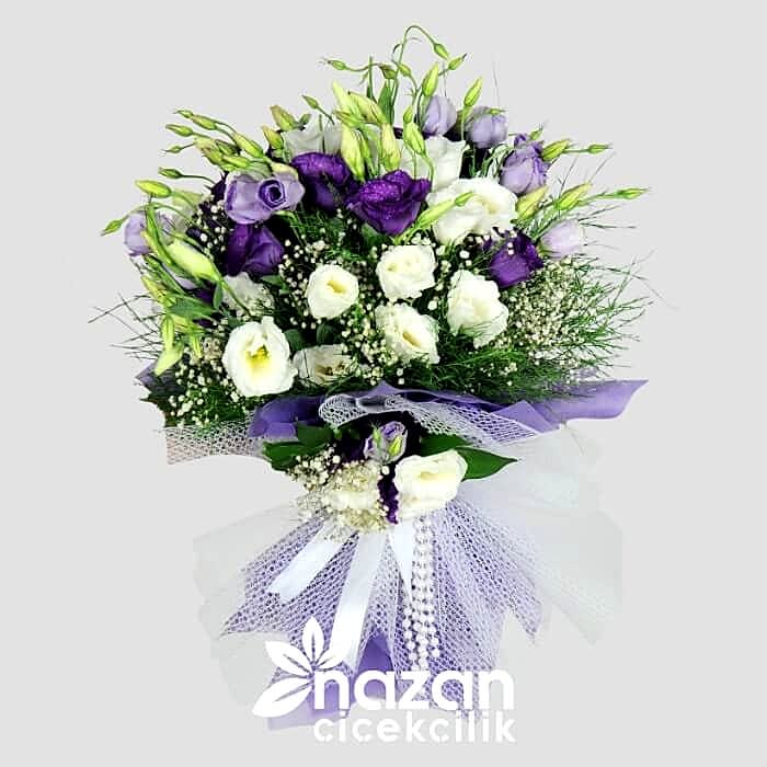 Beyaz ve mor lisyantuslar kullanılarak beyaz tergal ve mor elyaf üzerine hazırlanmış şık bir buket