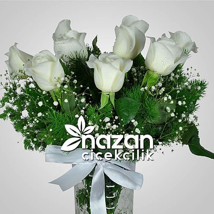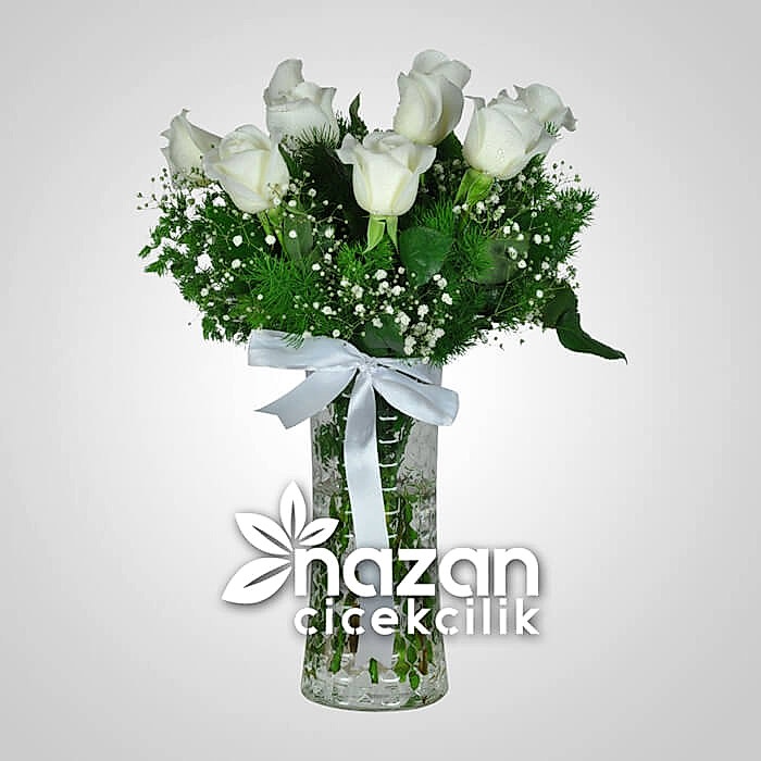 Şeffaf Silindir Vazoda Beyaz güllerle hazırladığımız şık bir aranjman