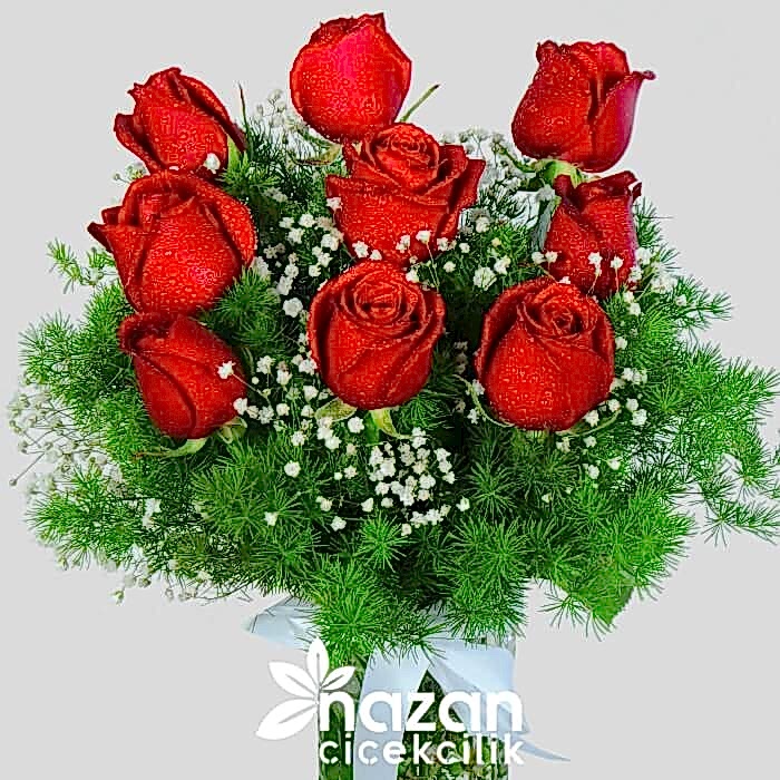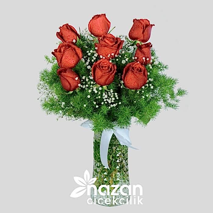 şeffaf silindir vazo içerisine 9 adet kırmızı gül yeşillik ve cipsofilya kullanılarak hazırlanmış şık bir tanzim