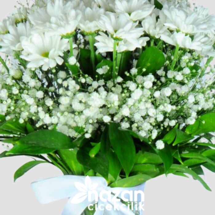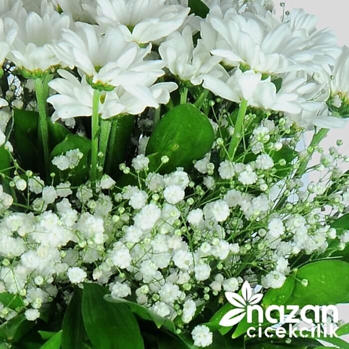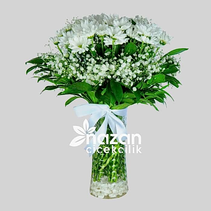 Şeffaf silindir vazo içerisine beyaz krizantem çiçekleri yeşillik ve cipsofilya kullanılarak hazırlanmış şık bir tanzim