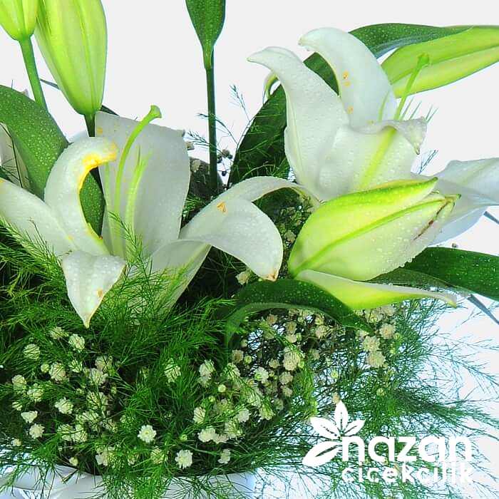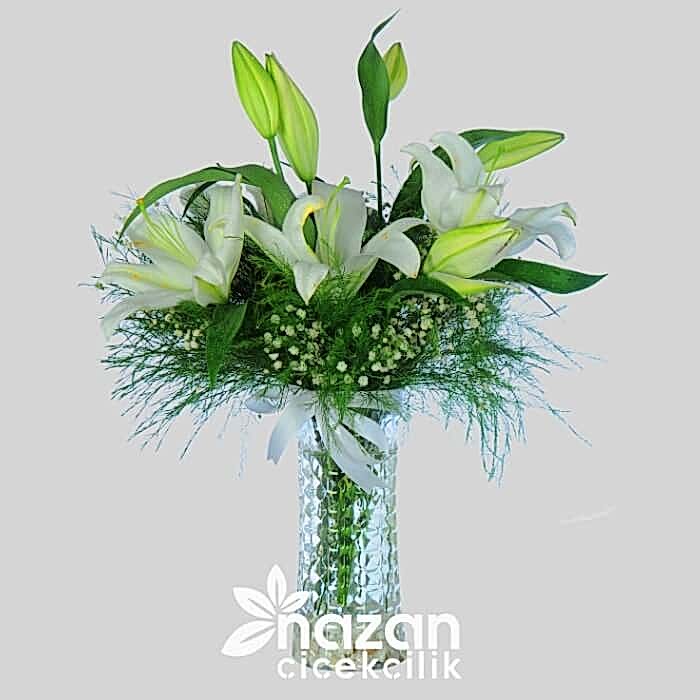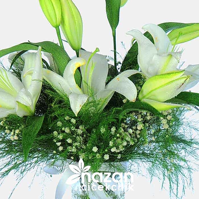 Şeffaf silindir vazo içerisine mis kokulu lilyum yeşillik ve cipsofilya kullanılarak hazırlanmiş sık bir tanzim