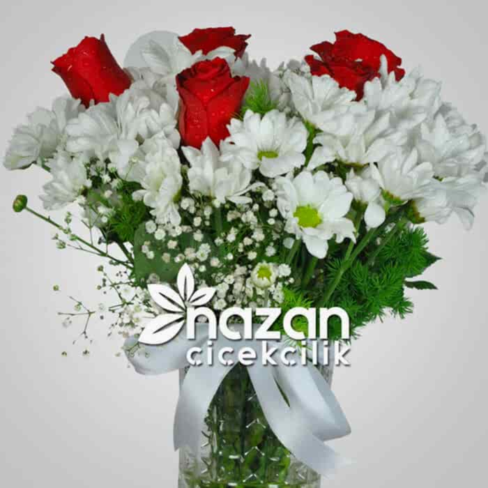 Şeffaf Silindir Vazoda Kır Çiçekleri ve Kırmızı Güller