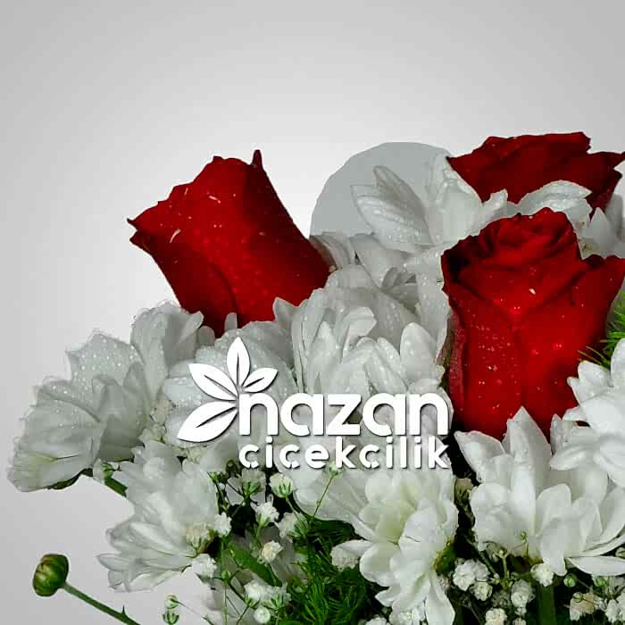 Şeffaf Silindir vazoda Kırmızı gül, Krizantem çiçekleri, cipsofilya ve yeşillik kullanarak hazırladığımız şık bir aranjman