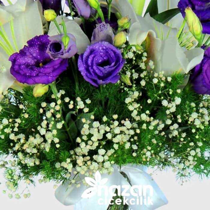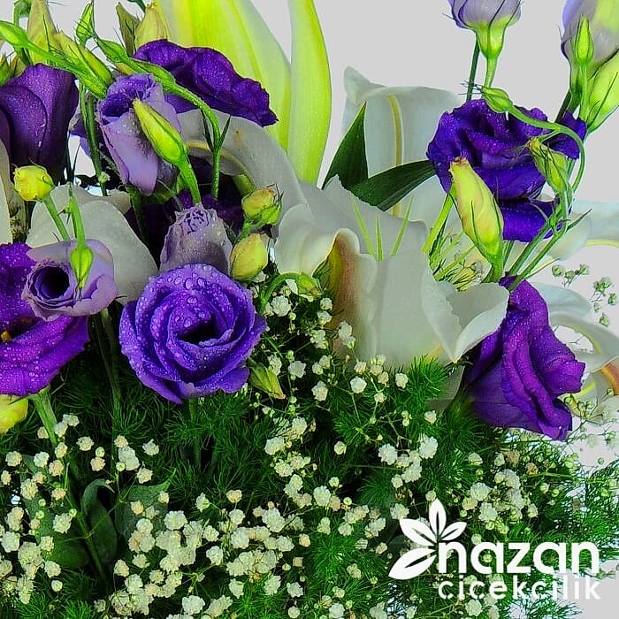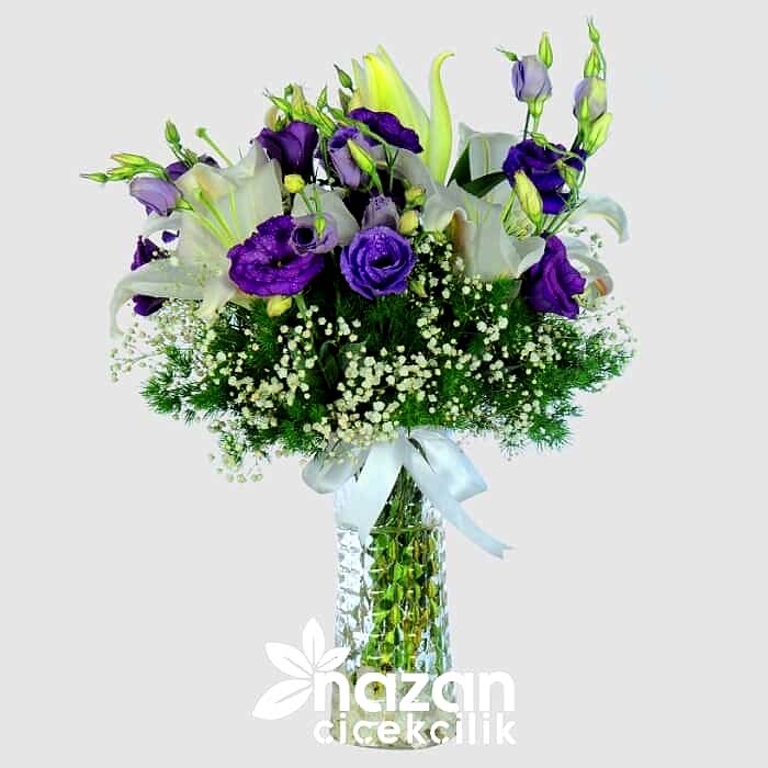Şeffaf silindir vazo içerisine mor lisyantus beyaz lilyum yeşillik ve cipsofilya kullanılarak hazırlanmış şık bir tanzim