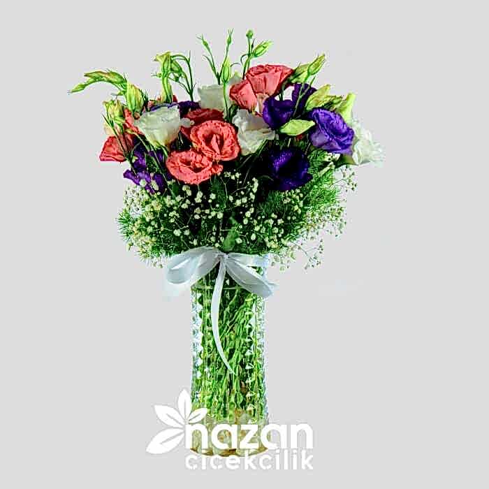Şeffaf Silindir Vazoda Renkli Lisyantuslar