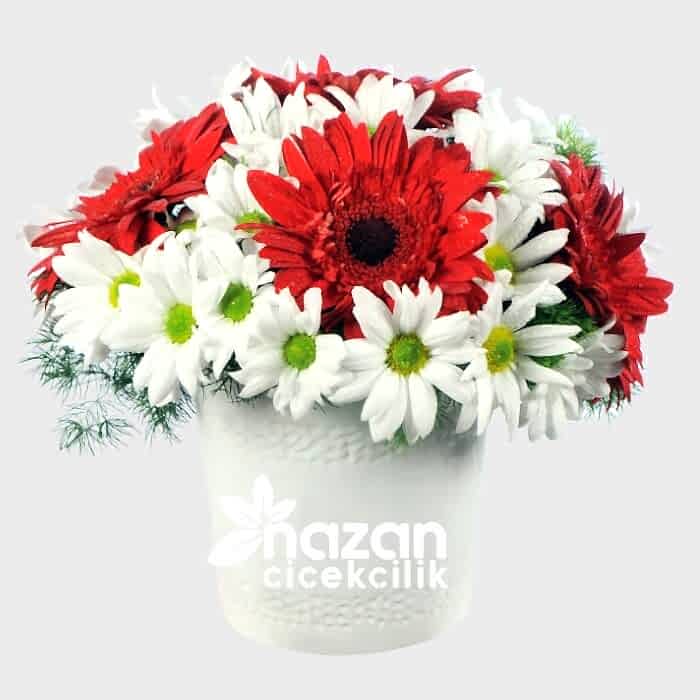 Seramik vazo içerisine krizantem ve gerbera çiçekleri kullanılarak hazırlanmış şık bir aranjman